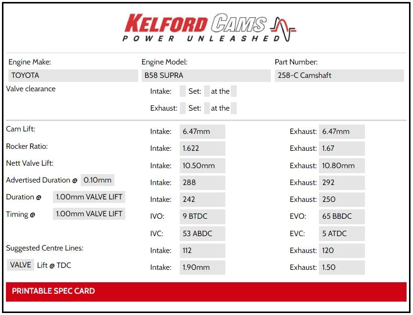 Kelford 288°/288° Распределительный вал Toyota Supra MK5 / BMW B58Подъем клапана 288°/288° | 10,35 мм/10,80 ммРаспределительные валы Toyota Supra B58 – 288° Кулачки для дрэг-рейсинга Stage 3 для профессиональных двигателей B58 Gen 2 мощностью 1200 л.с.+. Размер турбонаддува 72 мм+ при высоком наддуве. Тип топлива смесь этанола или метанол. Необходимо использовать продающийся на вторичном рынке нагнетатель высокого давления с переоборудованием корпуса дроссельной заслонки. Рекомендуем заблокировать систему Valvetronic на 100%..Kelford рекомендуют клапанную пружину KVS58-BT.