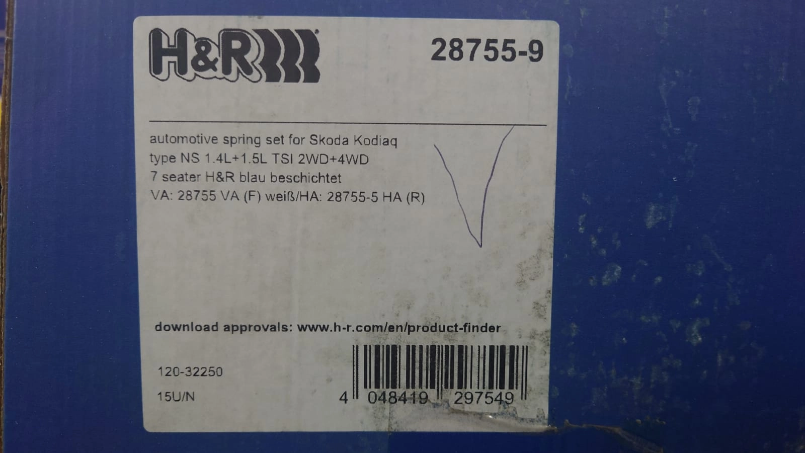 H&R 28755-9 Комплект пружин с занижением для Skoda Kodiaq 2WD+4WD 7-местныйСпортивные пружины H&R разработанные для повседневной езды, являются идеальным решением улучшения управляемости вашего автомобиля!Параметры занижения для Skoda Kodiaq 1.4+1.5TSI 2WD+4WD 2017->:Передняя ось -25 ммЗадняя ось -25 мм.