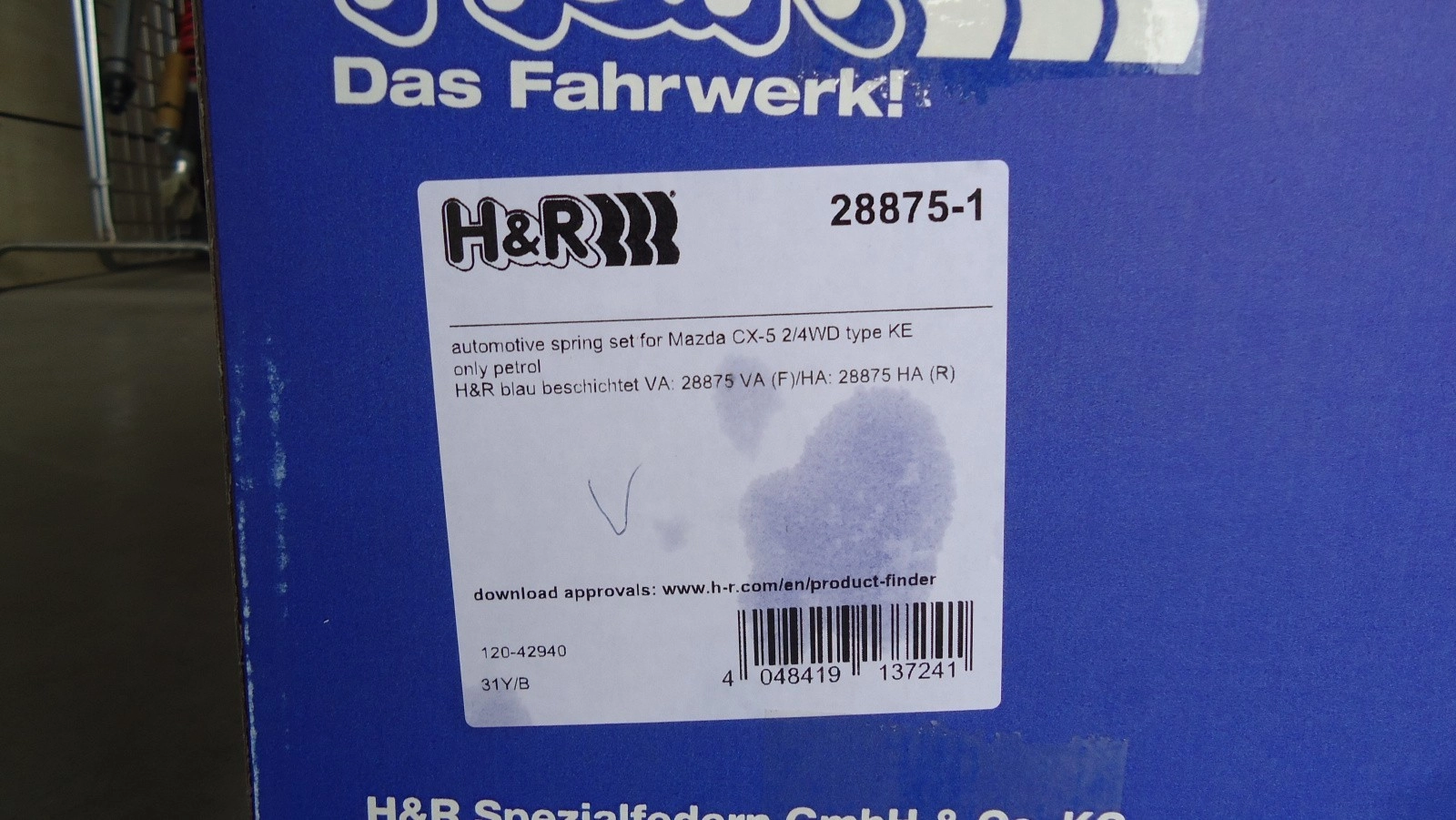 H&R 28875-1 Комплект пружин с занижением для Mazda CX-5 2WD+4WD (KE)Спортивные пружины H&R разработанные для повседневной езды, являются идеальным решением улучшения управляемости вашего автомобиля!Параметры занижения для Mazda CX-5 2WD+4WD (KE) 2012-2017гг (для бензиновых) :Передняя ось -30 ммЗадняя ось -45 мм.для 2WD занижение будет меньше