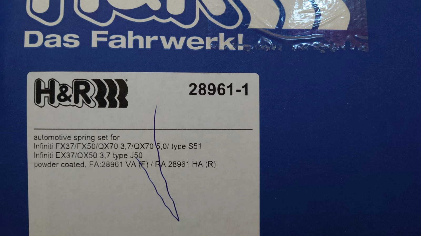 H&R 28961-1 Комплект пружин с занижением для Infiniti FX37, FX50, EX37, QX50, QX70Спортивные пружины H&R разработанные для повседневной езды, являются идеальным решением улучшения управляемости вашего автомобиля!Параметры занижения для Infiniti FX37, FX50, EX37, QX50, QX70 (J50+S51) 2008- :/ кроме дизельных /Передняя ось -25 ммЗадняя ось -25 мм.