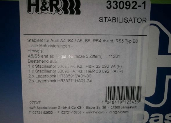 H&R Anti-Roll-Bars 33092-1. Стабилизаторы поперечной устойчивости для Audi A4 / RS4, A5 / RS5 (B8)Новые "усиленные" стабилизаторы H&R изготовлены из высокопрочной пружинной стали. Точнейшие кованые окончания и применение втулок из запатентованного композитного материала гарантируют остроту управления и значительно уменьшают крены кузова автомобиля.А для того, чтобы добиться максимального эффекта - стабилизаторы H&R можно сочетать со спортивной подвеской или пружинами H&R.Подходит для:Audi A4, RS4, A5, RS5 (B8) 2007-2016ггДиаметр переднего стабилизатора: 30 мм, имеет 2 (два) положения регулировки жесткостиДиаметр заднего стабилизатора: 24 мм, не имеет регулировок жесткостиВсе компоненты подвески H&R обрабатываются высококачественной защитой от коррозии и имеют TUV-сертификаты.