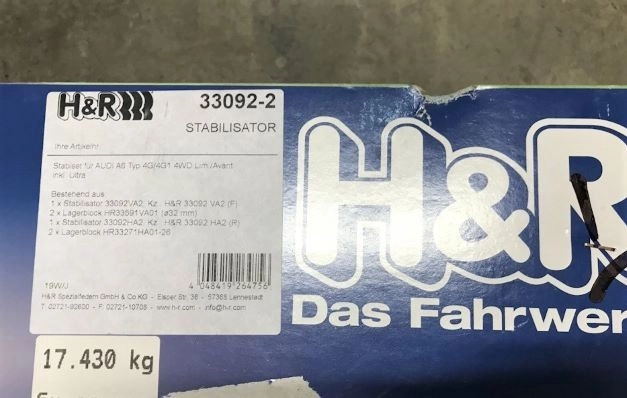 H&R Anti-Roll-Bars 33092-2. Стабилизаторы поперечной устойчивости для Audi A6 / A7 (C7), Q5 (8R)Новые "усиленные" стабилизаторы H&R изготовлены из высокопрочной пружинной стали. Точнейшие кованые окончания и применение втулок из запатентованного композитного материала гарантируют остроту управления и значительно уменьшают крены кузова автомобиля.А для того, чтобы добиться максимального эффекта - стабилизаторы H&R можно сочетать со спортивной подвеской или пружинами H&R.Подходит для:Audi A6/A7 (C7), Q5 (8R) 2011-2018ггДиаметр переднего стабилизатора: 32 мм, имеет 2 (два) положения регулировки жесткостиДиаметр заднего стабилизатора: 26 мм, не имеет регулировок жесткостиВсе компоненты подвески H&R обрабатываются высококачественной защитой от коррозии и имеют TUV-сертификаты.