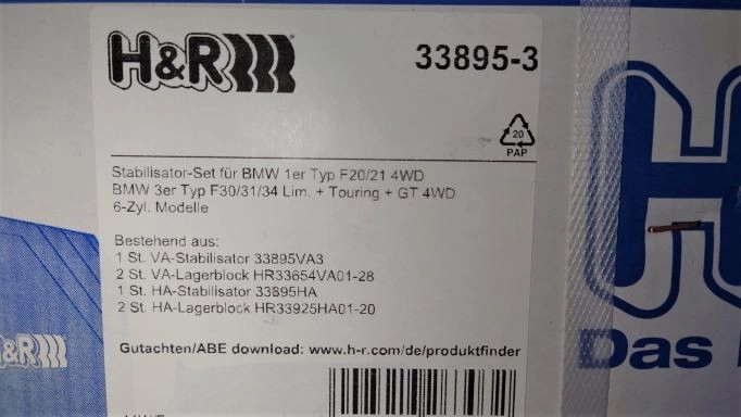 H&R Anti-Roll-Bars 33895-3. Стабилизаторы поперечной устойчивости для BMW F30, F32,F20,F22Новые "усиленные" стабилизаторы H&R для BMW F30, F32,F20,F22 изготовлены из высокопрочной пружинной стали. Точнейшие кованые окончания и применение втулок из запатентованного композитного материала гарантируют остроту управления и значительно уменьшают крены кузова автомобиля.А для того, чтобы добиться максимального эффекта - стабилизаторы H&R можно сочетать со спортивной подвеской или пружинами H&R.Подходит для:BMW 1 (F20+F21) 6цил. 4WD, включая M135, M145 4WDBMW 2 (F22+F23) 6цил. 4WD, включая M235, M245 4WDBMW 3 (F30+F31+F34) 6цил. 4WDBMW 3 (F32+F33+F36) 6цил. 4WDДиаметр переднего стабилизатора: 28 мм, имеет 2 (два) положения регулировки жесткостиДиаметр заднего стабилизатора: 20 мм, не имеет регулировок жесткостиВсе компоненты подвески H&R обрабатываются высококачественной защитой от коррозии и имеют TUV-сертификаты.