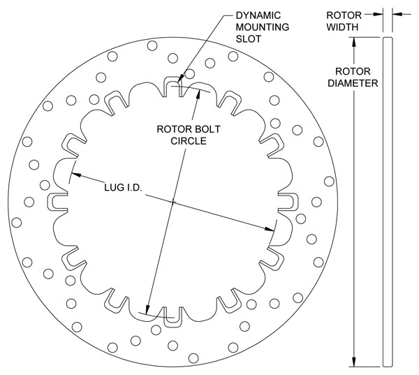 Динамический крепеж является наиболее эффективным методом устранения всех типов термических напряжений и деформаций в стальных роторах. Эти роторы имеют монтажные пазы, которые используются со специальными Т-образными шайками и комплектами болтов. Эта система крепления позволяет ротору расширяться и сжиматься независимо от монтажной шляпки или ступицы при изменении температуры ротора. Это устраняет любое напряжение или заедание в точках крепления. Роторы работают точнее, служат дольше, а всякая необратимая нагрузка на шляпки или ступицы устраняется. Динамический монтаж предпочтителен во всех случаях, когда временные, но экстремальные скачки температуры могут вызвать высокие скорости расширения стали.