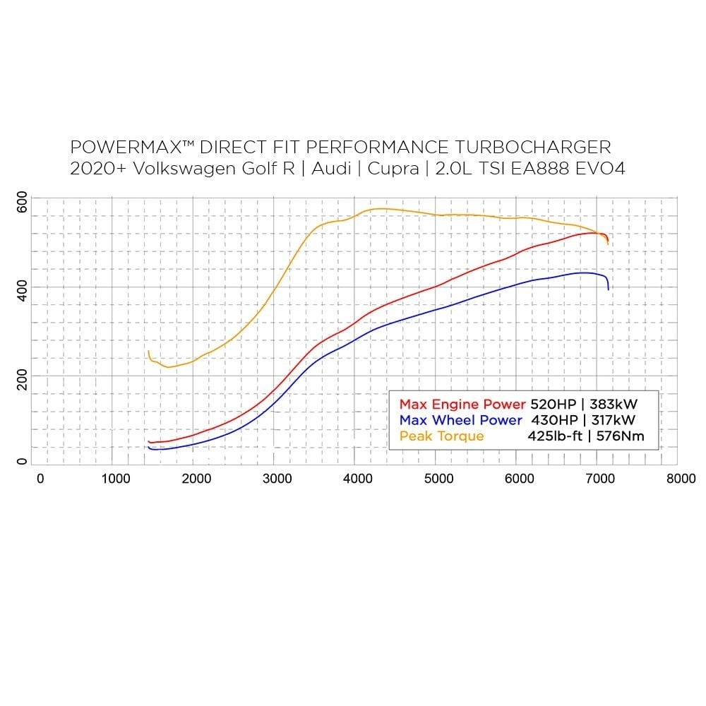 Garrett POWERMAX™ GT2563S для 2020+ Volkswagen Golf R | Audi | Cupra | 2.0L TSI EA888 EVO4Представляем турбокомпрессор Garrett PowerMax 2020+, который обеспечивает максимальное повышение производительности вашего 2,0-литрового двигателя TSI EA888 EVO4.Независимо от того, владеете ли вы Audi A3, Golf R или Cupra Formentor, эта турбина поднимет ваш опыт вождения на новый уровень.Лучшее болт-он решение от Garrett для получения максимальной производительности!Мощность на выходе до 520 лошадиных сил!Ключевые особенности комплекта:Болт-он комплект с откалиброванным актуаторомДо 550 л.с. | 410 кВт (на автомобиле получается 520 л.с. | 383 кВт - при консервативной настройке)+20% расхода воздуха по сравнению с заводской турбиной+37% продуваемость горячей части по сравнению с заводской турбинойАдаптирована аэродинамика компрессорного колесаАдаптирована аэродинамика современного турбинного колеса, изготовленного из сплава Mar-M, рассчитанного на температуру до 1050°CКорпус турбины из нержавеющей стали, рассчитанный на температуру до 1050°CУсиленные подшипники.