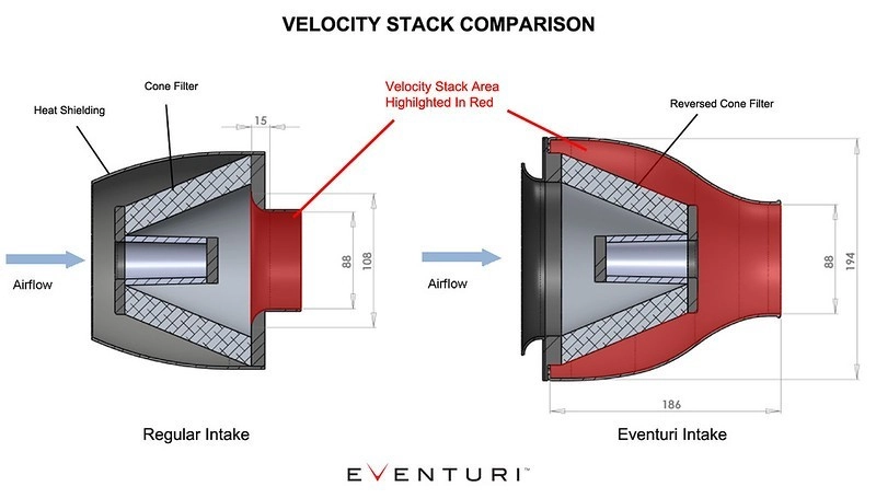 Система RS5 / RS4 Eventuri использует запатентованные корпуса из углеродного волокна, которые обеспечивают аэродинамически эффективный путь воздушного потока от фильтров к корпусам дроссельной заслонки. Не просто еще один конусный фильтр с теплозащитным экраном, а уникальный дизайн Eventuri.