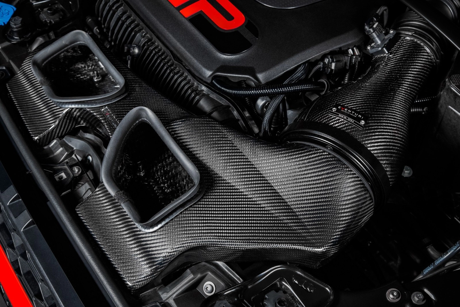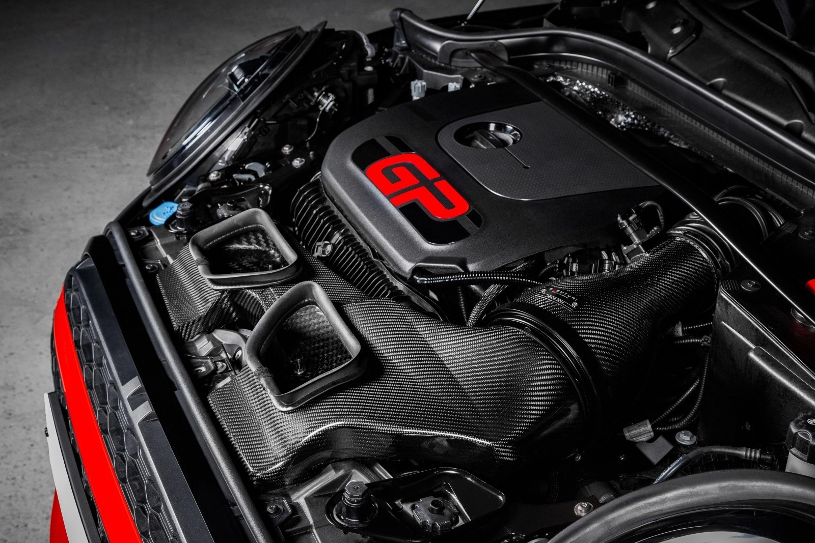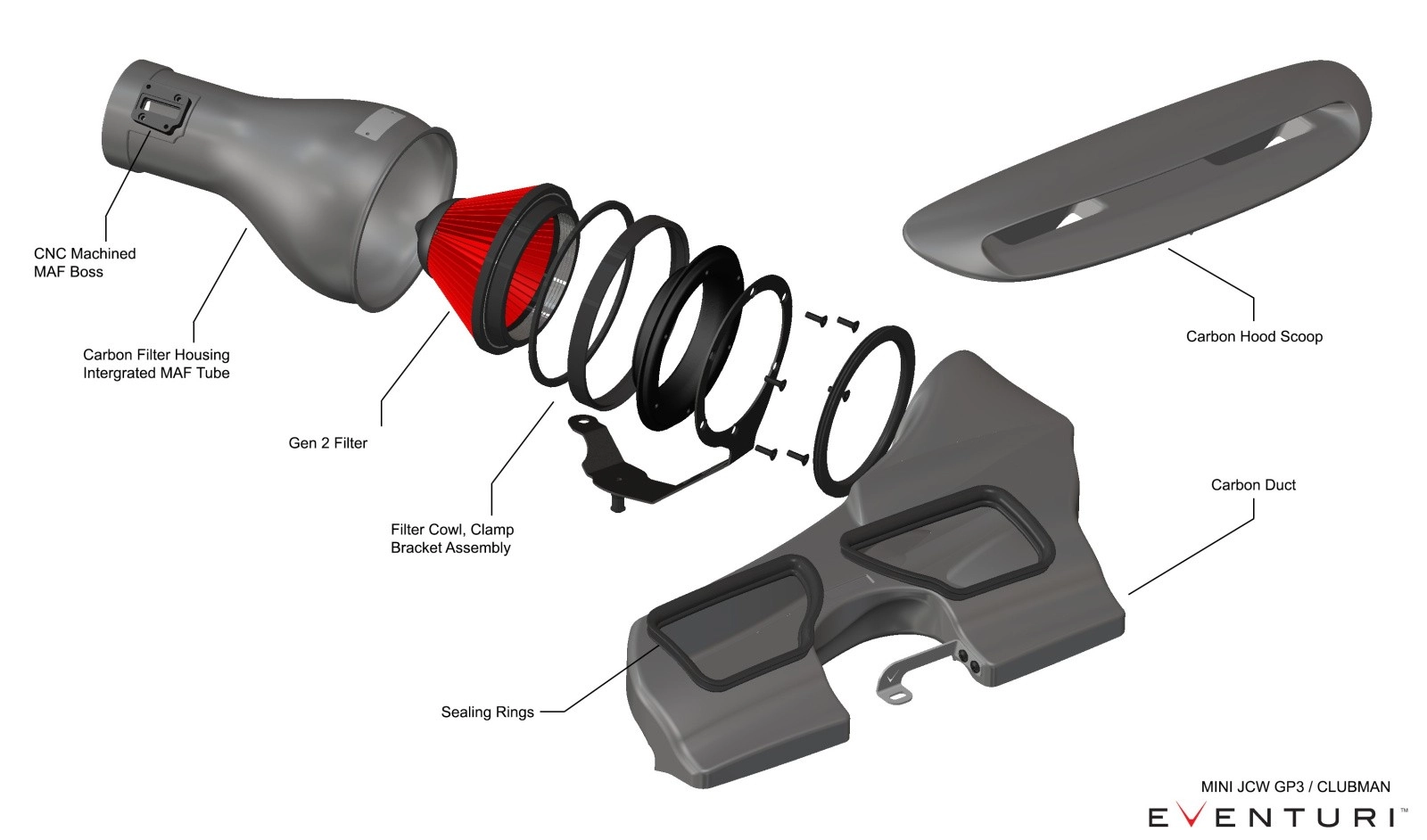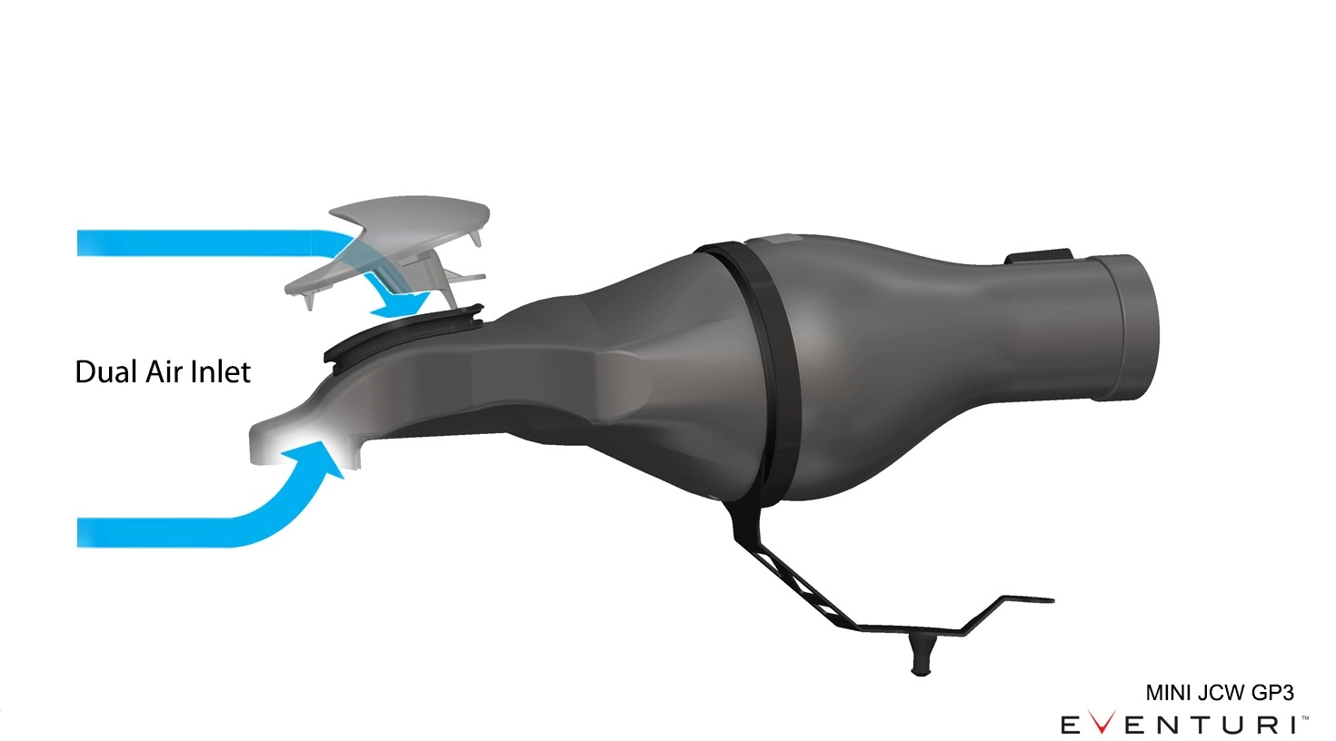 Это герметичная система, которая гарантирует, что турбонаддув не забирает горячий воздух из моторного отсека, но дополнена функциональным капотом, который нагнетает окружающий воздух во впускной канал. Этот воздуховод имеет больший внутренний объем, чем стандартная версия, и также отводит воздух из запасного места над радиатором. Сочетание герметичной системы с воздухозаборником обеспечивает более низкую температуру на входе, чем в стандартной воздушной камере, и позволяет избежать перегрева, что является распространенной проблемой, особенно на мини-машинах с более высокой мощностью. Для обеспечения максимально плавного потока мы используем наш запатентованный корпус фильтра Eventuri, который имеет встроенную секцию MAF для беспрепятственного прохождения потока к турбонаддуву.