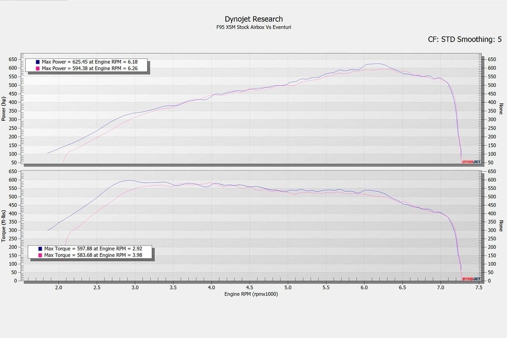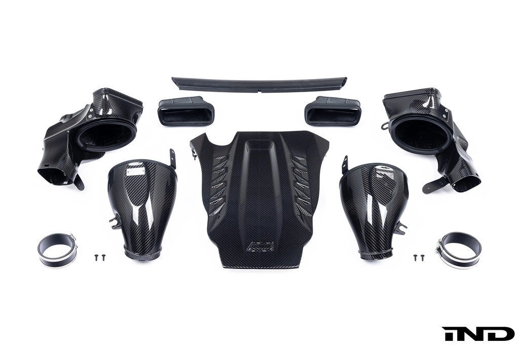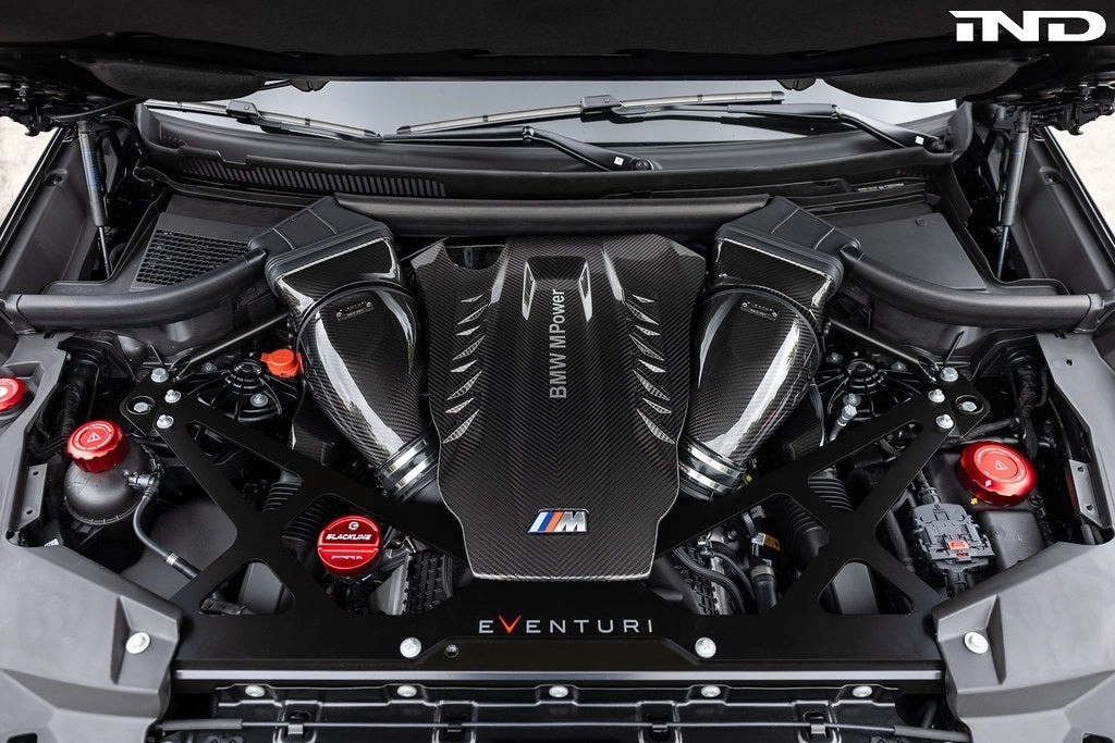 Eventuri EVE-X56M-CF-INT Впускная система для BMW F9X X5M / X6M / G09 XMПрибавка мощности до 30 л.с.!Этот впуск является результатом обширных исследований, разработок и испытаний, направленных на улучшение проходимости системы подачи воздуха.Система представляет собой полную переработку стандартных воздухозаборников с целью снижения потери давления при одновременном увеличении расхода воздуха и поддержании низких температур на входе.При подаче холодного воздуха в передней части автомобиля и турбозаборниках, обращенных к задней части автомобиля, воздушному потоку приходится поворачиваться на 180 градусов через каждую воздушную камеру, что приводит к ограничению потока. Чтобы преодолеть это, Eventuri внедрили дополнительную подачу холодного воздуха из панели, что обеспечивает более прямой путь потока к входу в турбины.Дополнительные каналы подачи позволяют увеличить количество воздуха на впуске при сохранении низкого уровня температуры и имеют дополнительное преимущество в снижении шума турбин. Теперь, когда впускные отверстия обращены к салону, отчетливо слышны звуки турбонаддува и сброса давления, что поднимает впечатления от вождения на новый уровень.В системах Eventuri F9X X5M, G09 XM используются запатентованные корпуса из углеродного волокна с фильтрами, изготовленными на заказ, которые обеспечивают аэродинамически эффективный путь воздушного потока от фильтра к турбинам.Это не просто еще один конусный фильтр с теплозащитным экраном, а уникальная конструкция, которая использует эффект Вентури и поддерживает условия ламинарного потока для снижения лобового сопротивления турбонаддува.В комплекте:2 запатентованных корпуса фильтров из углеродного волокна2 х изготовленных на заказ высокопроизводительных сухих конусных фильтра2 сдвоенных воздуховода из углеродного волокнаКрышка двигателя из углеродного волокна2 задних воздухоподвода из EPDMСиликоновые пайпыКрепления кронштейнов, обработанные на станке с ЧПУЛоготип /M в комплекте.Подходит для:F95 X5MF96 X6MG09 XMG05 X5 M60iG06 X6 M60iG07 X7 M60i