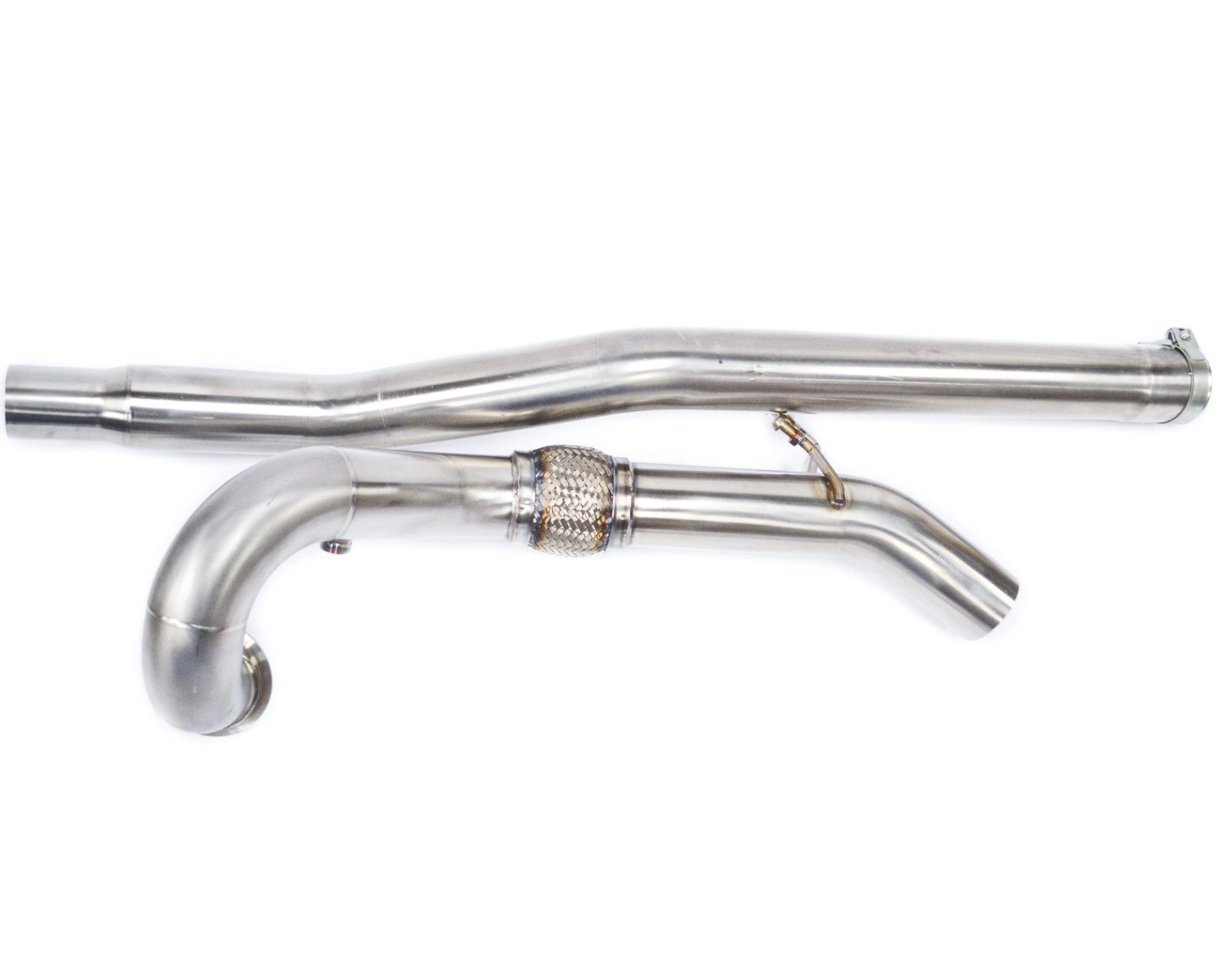 даунпайп имеет диаметр 76.1мм (3 дюйма) с плавным переходом в 60/65мм для стыковки со штатной выпускной системой